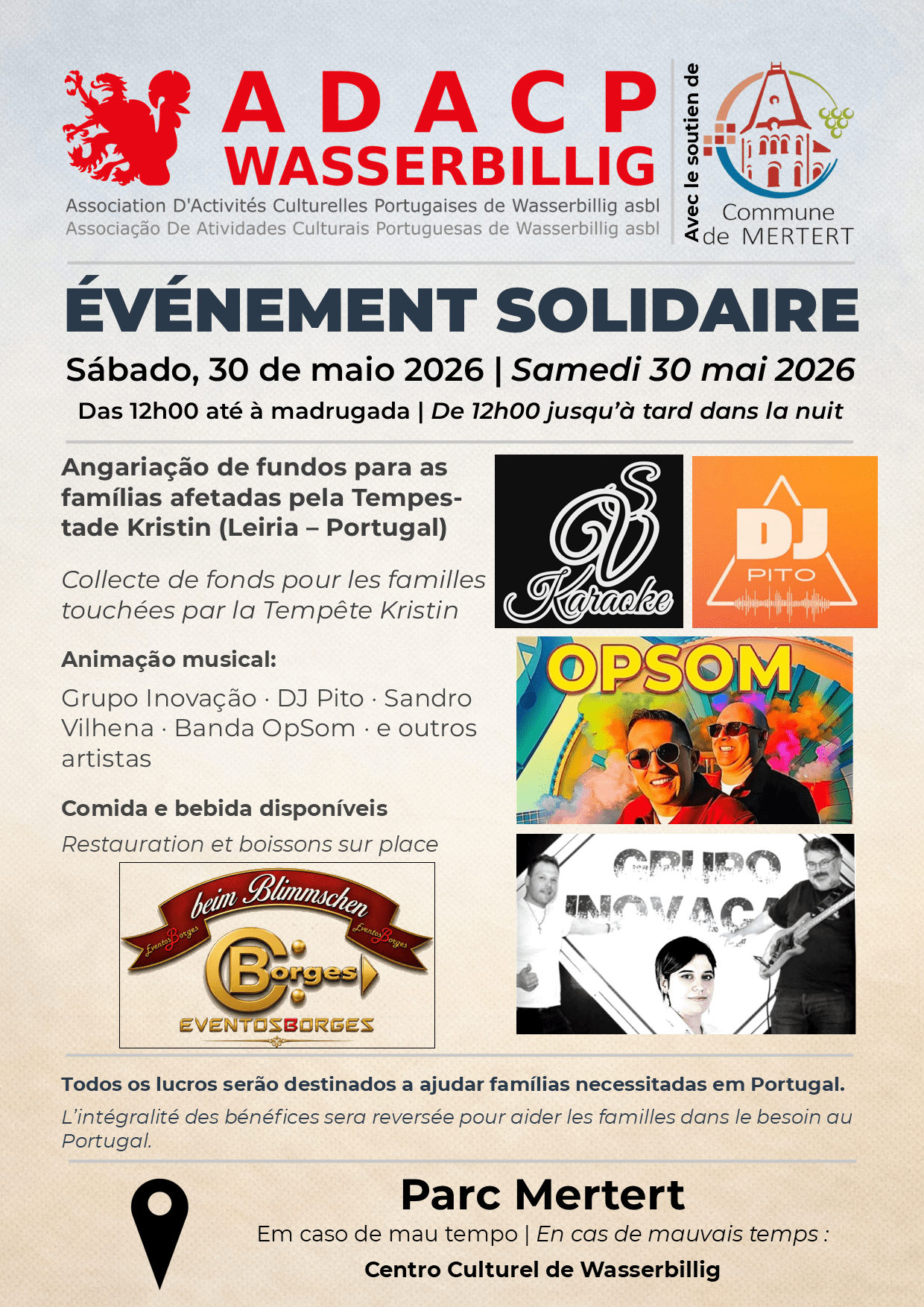 A Associação de Actividades Culturais Portuguesas de Wasserbillig promove um evento solidário no dia 30 de Maio de 2026, no Parc de Mertert, com o objectivo de angariar fundos para as famílias afectadas pela Tempestade Kristin na região de Leiria, em Portugal. Com início marcado para as 12h00 e a prolongar-se até à madrugada, a iniciativa conta com o apoio da Commune de Mertert e reúne um cartaz musical de peso, com actuações do Grupo Inovação, da Banda OpSom, de Sandro Vilhena, do DJ Pito e ainda de outros artistas, complementadas por sessões de karaoke. Em caso de mau tempo, o evento terá lugar no Centro Culturel de Wasserbillig. Todos os lucros serão integralmente destinados às famílias necessitadas em Portugal, com comida e bebida disponíveis no local a cargo da Eventos Borges.