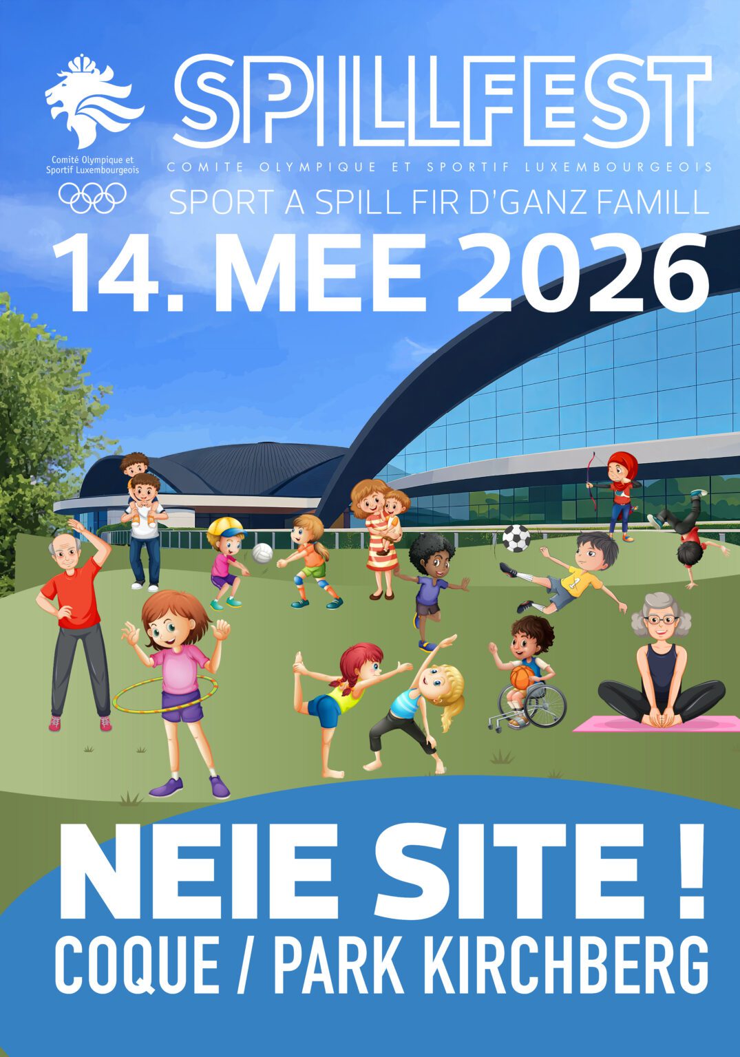 O Comité Olímpico e Desportivo Luxemburguês (COSL) realiza a edição de 2026 do Spillfest no dia 14 de maio, feriado da Ascensão, numa localização inédita: a Coque e o parque do Kirchberg, das 10h00 às 17h30.
