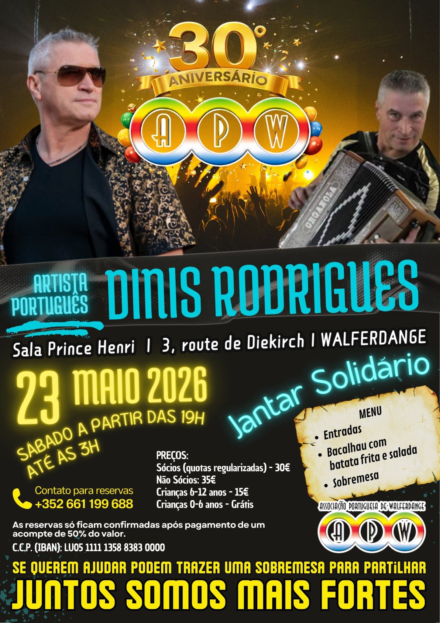 A Associação Portuguesa de Walferdange assinala, no próximo dia 23 de maio de 2026, três décadas de existência com um jantar solidário e espetáculo musical na Sala Prince Henri, em Walferdange, num evento que promete reunir a comunidade portuguesa em torno da celebração, mas também de uma causa maior. A iniciativa, com início marcado para as 19h e a prolongar-se pela noite dentro, contará com a actuação do artista português Dinis Rodrigues, num ambiente de convívio onde a música popular se cruza com o espírito solidário que define a associação desde a sua fundação.